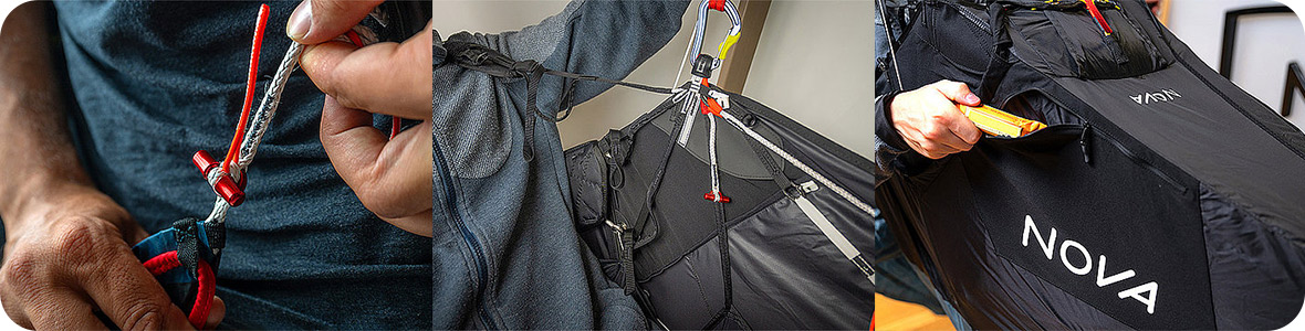 Um schnell und sicher starten zu können, ist es wichtig, dass das Artus-Gurtzeug richtig geschlossen ist. Anhand des Diagramms auf den Beinschlaufen können Sie leicht erkennen, wie die farbigen Gurte mit den entsprechenden Metallstäben und Ringen zu verbinden sind. Die Farbkodierung für jede Seite entspricht dem vertrauten Schema, das Sie bei den meisten Gleitschirmen finden NOVA, wodurch die Möglichkeit einer falschen Befestigung vermieden wird: rot für links und grün für rechts.