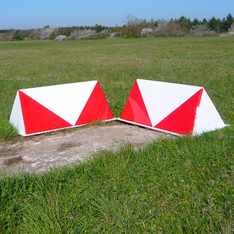 The grass dihedral markers are essential devices for runway signaling at airports and airfields, particularly those with grass runways. They are specially designed to mark the ends and edges of runways, which is crucial for safety during landing and takeoff operations. The dihedral design of these markers, with their two-panel angled configuration, allows for optimal visibility. Typically red and white in color, they provide a high contrast that helps pilots clearly identify the runway boundaries.