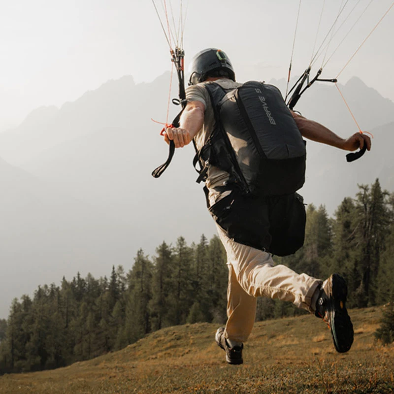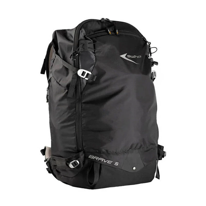 En quelques gestes, la Brave 5 se transforme en un sac à dos de 45 litres, au style épuré et aux fonctionnalités abouties. Il peut accueillir votre aile de parapente, un parachute de secours, un casque et d’autres accessoires. Il dispose de passants pour skis ou bâtons, d’un filet à casque escamotable, d’un système de portage ventilé avec bretelles ergonomiques et d’un compartiment zippé matelassé pour protéger les objets sensibles. Une fois en vol, ce sac disparaît totalement dans le compartiment arrière sans gêner.