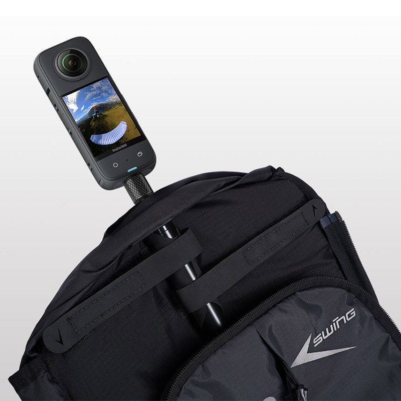 Le module ZIPON speedriding/flying dispose d’un espace de rangement arrière de 25 litres, suffisant pour stocker le matériel essentiel en vol. Il comporte deux poches extérieures zippées, un compartiment interne pour objets de valeur, ainsi que des passants pour bâtons de ski ou de rando. Le système Cam Mount permet d’installer une perche 360° de manière stable et sécurisée sur le dos de la sellette.